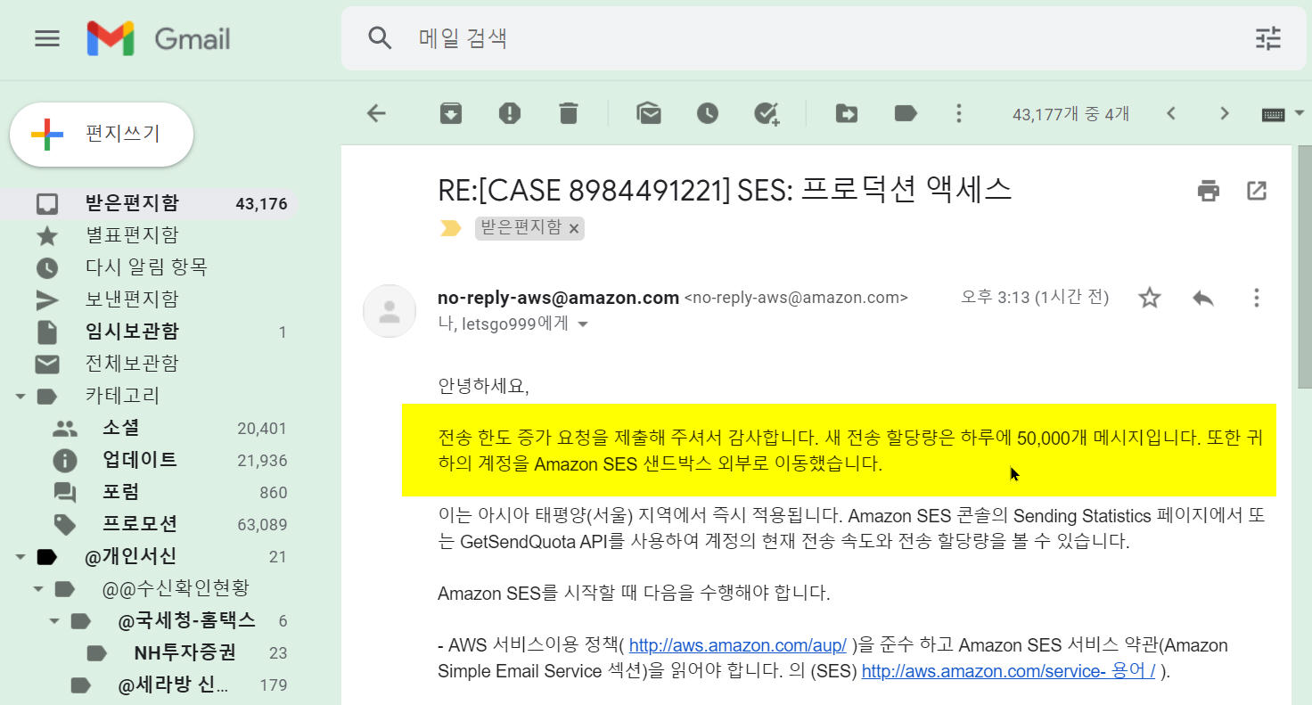 따로 전송 통수를 정해서 증설 요청을 하진 않았는데, 알아서 하루 5만개로 용량을 늘려주고, 초당 발송 메일수도 1개에서 14개로 증설해주었다. 무엇보다 중요한 건 사용자 계정 상태가 sandbox (개발자 테스트 모드)에서 공식적으로 외부로 이동(out of sandbox =공개 출시!) 되었다는 점이다.