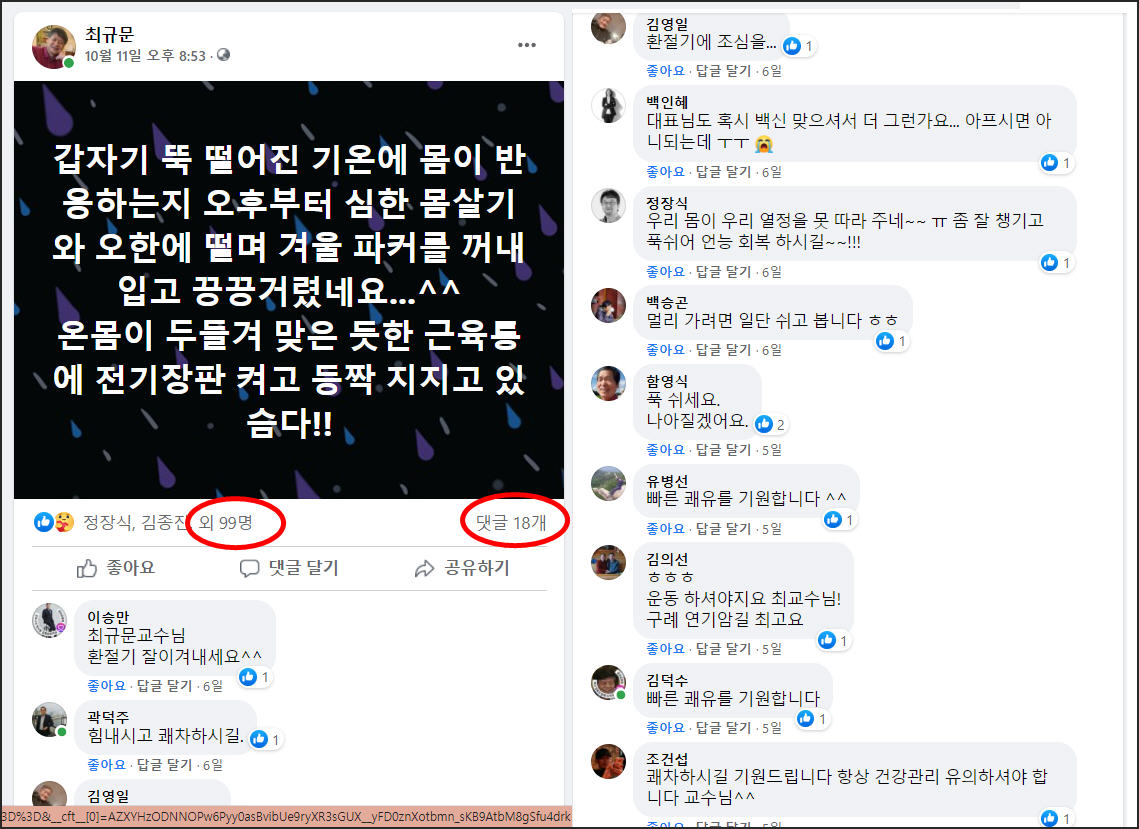몸살 소식을 알리는 짤막 포스트에 100개가 넘는 좋아요 클릭과, 20개 가까운 염려 댓글이 붙었다.