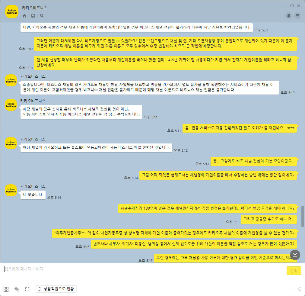 무슨 법률사무소나 노무사무소와 같이 법정 상호명에 개인 이름을 밝히는 정도의 사정이 아니라면 카카오톡 채널 이름에 개인 이름을 넣을 수 없다는 통보를 에누리 없이 받았다!!