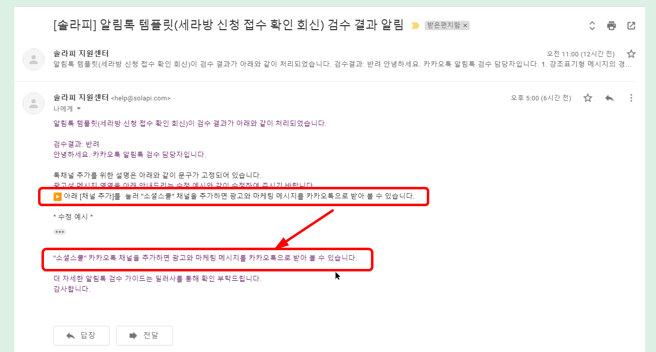 이를 위해 벌써 2년 전에 계정만 만들어두고 거의 쓸모 없이 방치했던 [솔라피] 서비스를 되살려 새로운 카카오톡 채널(소셜스쿨)을 하나 추가로 개설하고 어렵사리 [비즈니스 채널]로 인증을 받았다. 당연히 곧장 테스트 용도의 [알림톡 템플릿]을 작성해서 신청을 넣었는데, 한 나절도 지나기 전에 보기 좋게 반려 당했다!