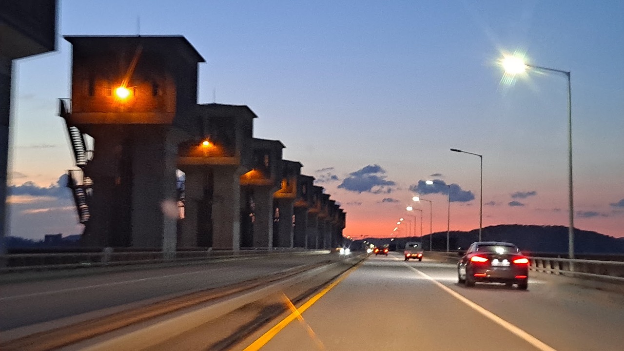 멀뚱히 차 안이나 식탁에서 시간을 버리기엔 아까운 마음이 들어, 이왕 군산까지 왔으니 포구의 야경이라도 한번 구경하자는 생각이 퍼뜩 들었다. 오는 동안 표지판에 자주 나온 "금강하구둑"을 내비로 검색해보니 불과 15분 거리였다.