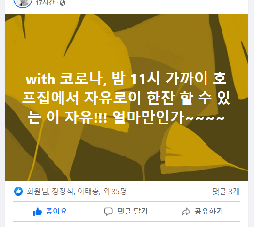 늘 밤 10시면 마치 통금 시각에 걸린 것처럼 자리를 쫓겨 나와야 했던 2년간의 모습이 사라지고 무려 밤 11시가 넘도록 친구들과 술잔을 맞댈 수 있음에 대한 "감격"어린 인증 글들이다.