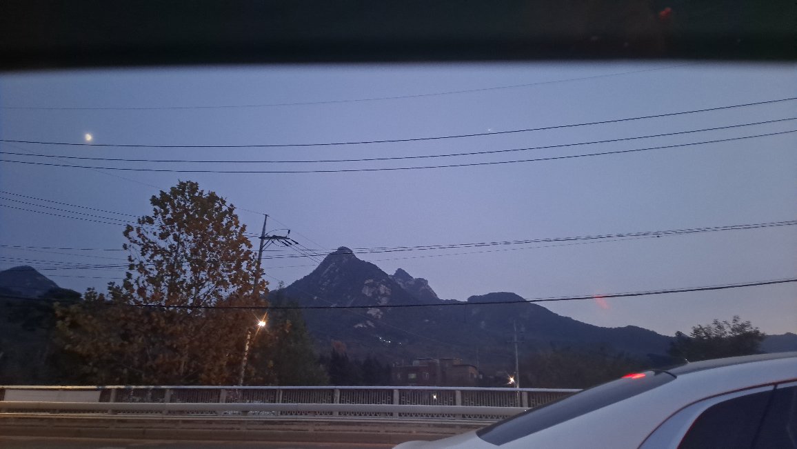 이미 해가 지고 어두워져가는 사위 넘어 남동편으로 바라뵈는 북한산 봉우리 위로 달이 떠오르고 있었다.