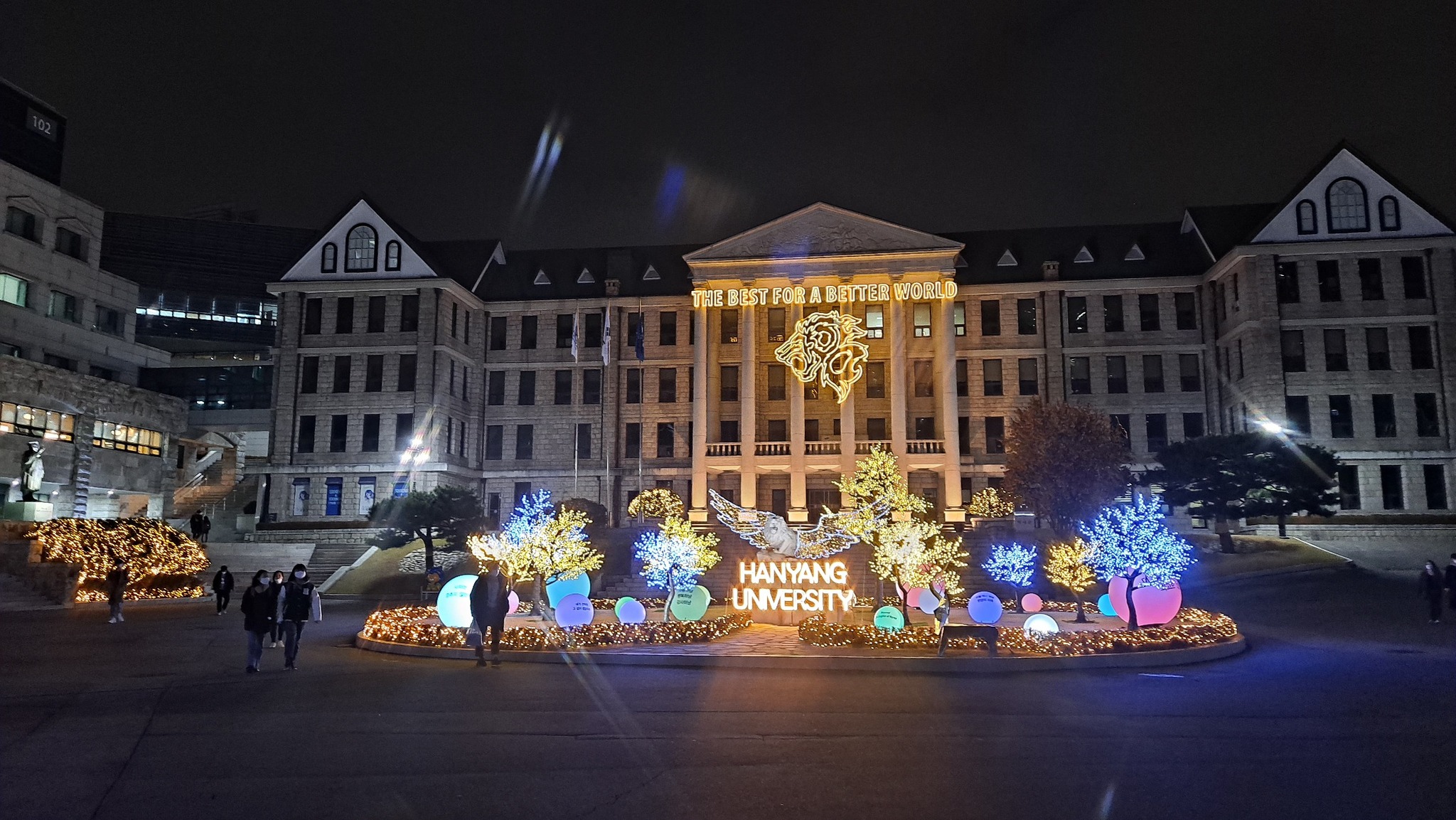 아무튼 두어 시간을 미디어의 변화 현실, 특히 유튜브를 중심으로 한 뉴스 미디어의 변화 흐름에 대해 짚어주고 나오니까 6시 퇴근 시간이었고, 캠퍼스에 이미 어둠이 깔려 껌껌한 상황이었다. 지하철 입구로 향하는 데 캠퍼스에 연말 분위기가 물씬 풍겼다. 그도 그럴 것이 이런 광경이 야광 조명으로 연출되고 있었던 덕분이다.