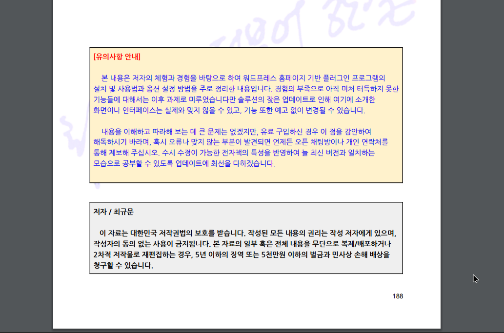 책 분량도 만만치 않다. A4 11폰트 행간 130% 기준으로 188쪽 분량이다. 일반적인 도서 사이즈로 치면 대략 어림잡아도 400쪽이 훌쩍 넘는 분량이다. A4 크기의 대학교재 사이즈로 엮는다 해도 280쪽 이상은 충분히 나올 것으로 짐작된다.