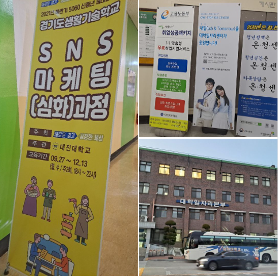 중부여성발전센터와 성남여성인력개발센터, 그리고 또 한 군데가 바로 포천에 있는 대진대학교 과정이다.각각 총 교육 시간은 다르지만 주제는 대체로 SNS 마케팅 실전 교육이나 디지털 마케팅 전문가 양성 과정을 표방하고 있는 곳들이다.