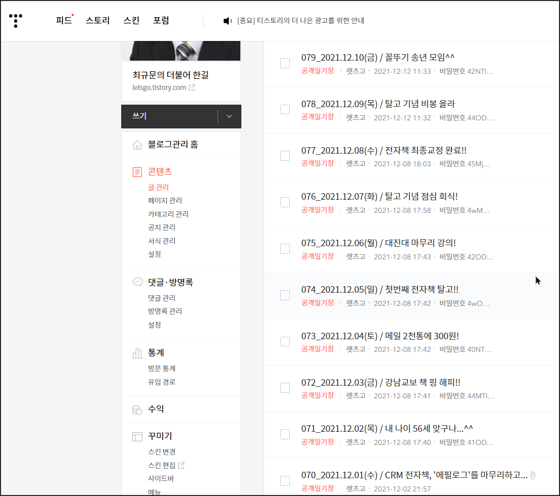 | 1. 백일야방 (유튜브 라이브 "최규문의 디마불사") 135회 마무리! 한 회 2시간씩 270시간 분량 영상 콘텐츠 축적 2. CRM 전자책 발간 ("플루언트 CRM 한글 사용 가이드북") A4 크기 11폰트 188쪽 분량, 텍스트 콘텐츠 발행 3. 백일백포 (티스토리 "최규문의 더불어한길") 9.23~12.31 일까지 블로그 [공개일기장] 포스트 100개 추가! |
