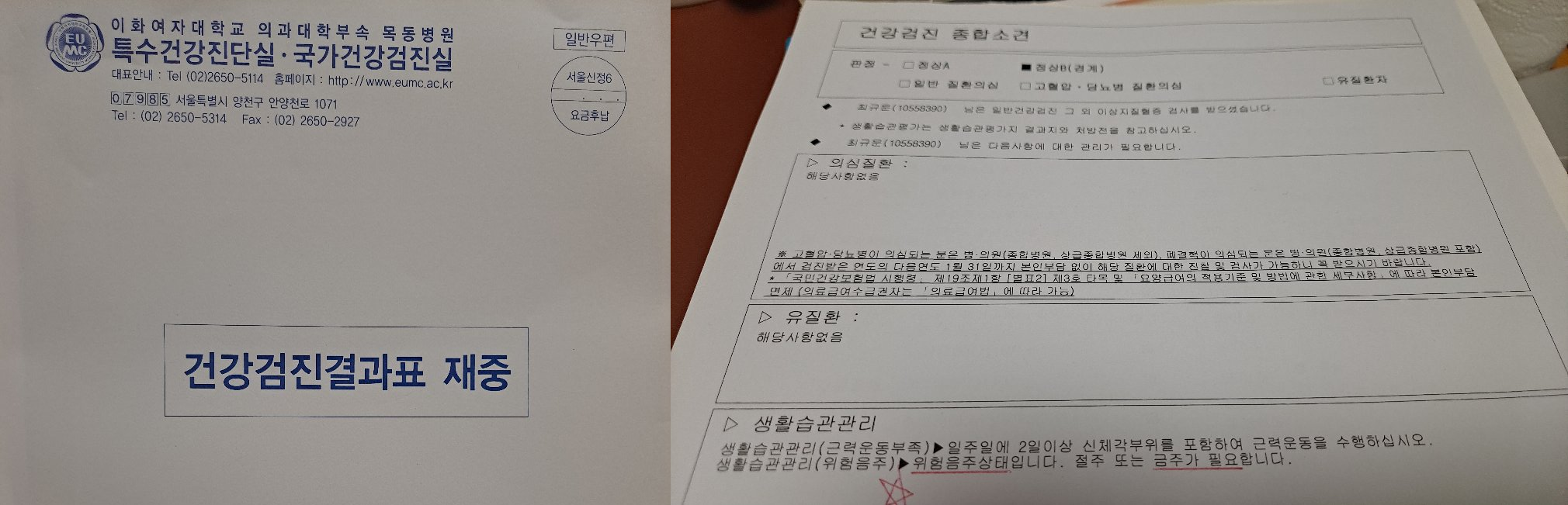 첫장 개요 페이지를 보니 [건강검진 종합소견] 에 정상B(경계) 판정에, 의심질환이나 유질환에는 "해당 사항 없음"이다!