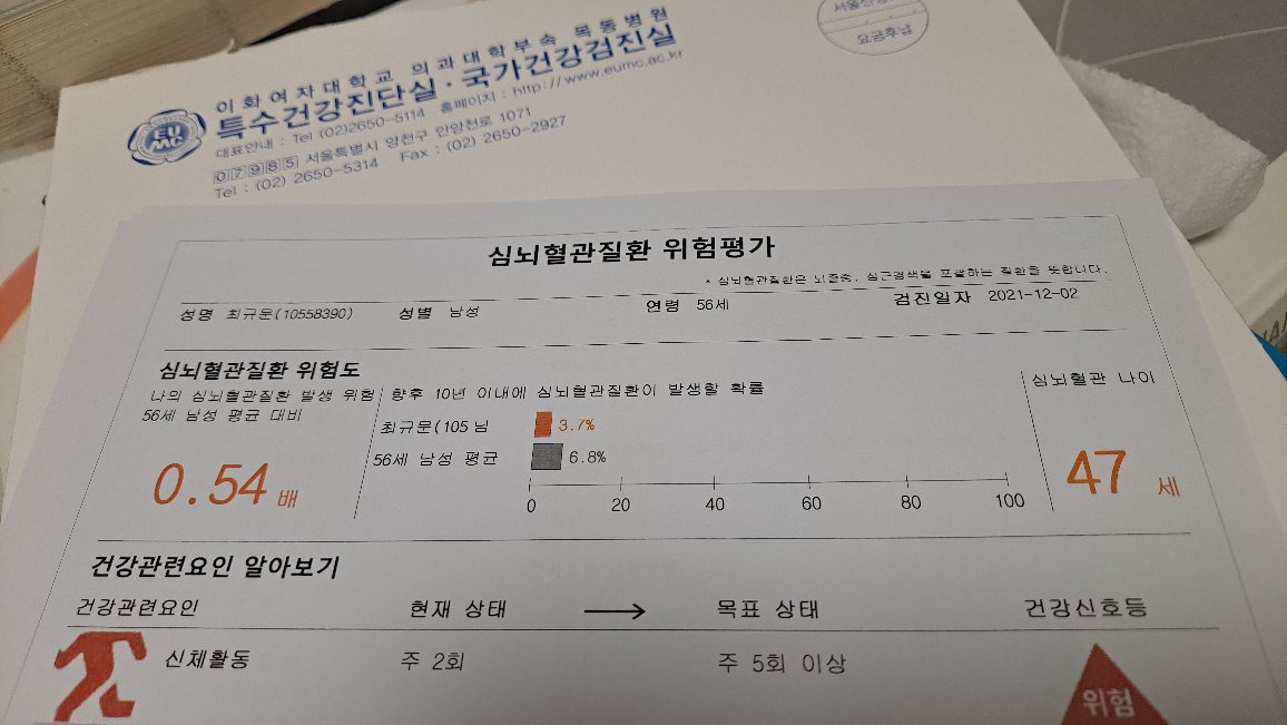 위험도를 보니 56세 남성 평균치 대비 위험도는 0.54배, 향후 10년 이내 심뇌혈관질환 발생 확률은 평균 6.8%의 절반 수준인 3.7%, 그리하여 심뇌혈관 나이로 치면 47세 수준으로 실제 나이보다 10년은 어린 상태로 나왔다. 다만 신체 활동이 현재 주 2회 수준인 것을 주 5회 이상을 목표로 삼아야 위험 신호등이 켜진 건강상태를 벗어날 수 있다는 이야기다.