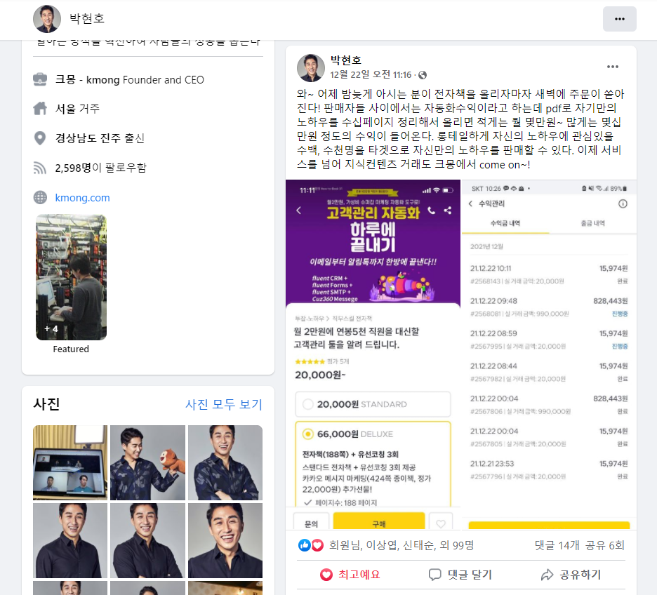 그 덕분에 하루가 지난 아침엔 나도 미처 몰랐는데, 오랜 절친이기도 한 크몽의 박현호 대표님이 자신의 페이스북 타임라인에 직접 내 상품에 대한 포스트를 공개해서, 감사하게도 거래액 인증을 통해 간접 홍보 지원까지 해주셨다.