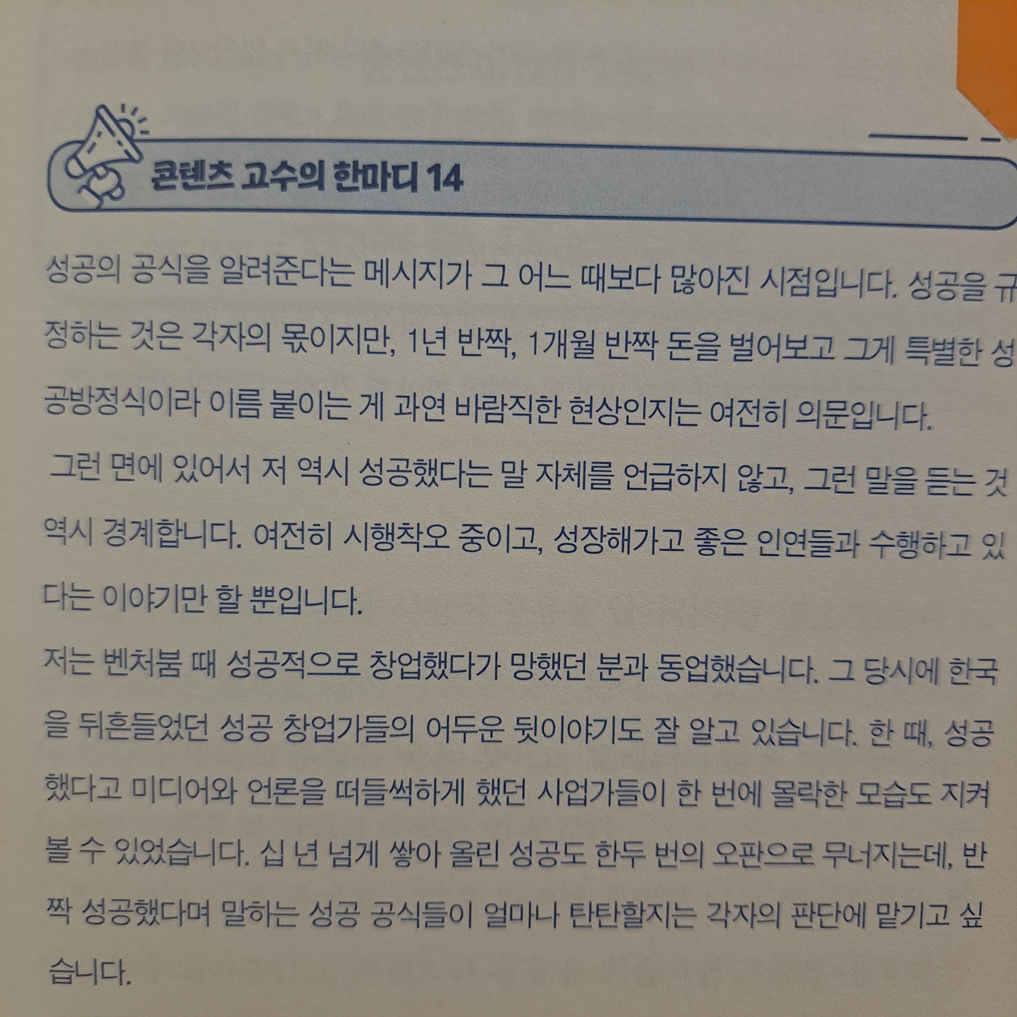 마지막 장인 챕터4. "콘텐츠로 부를 이룰 창업자는 세 가지 착각을 경계한다" 편에서는 콘텐츠 마케팅을 통해 뭔가를 이루고 이른바 성공을 하려거든 다음의 세 가지 착각을 경계하라고 조언하며 마무리합니다.