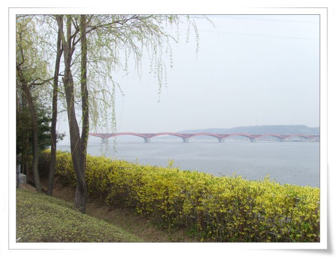 멀리 성산대교를 등지고 선 버드나무 아래 울타리의 개나리 노오란 꽃가지들도