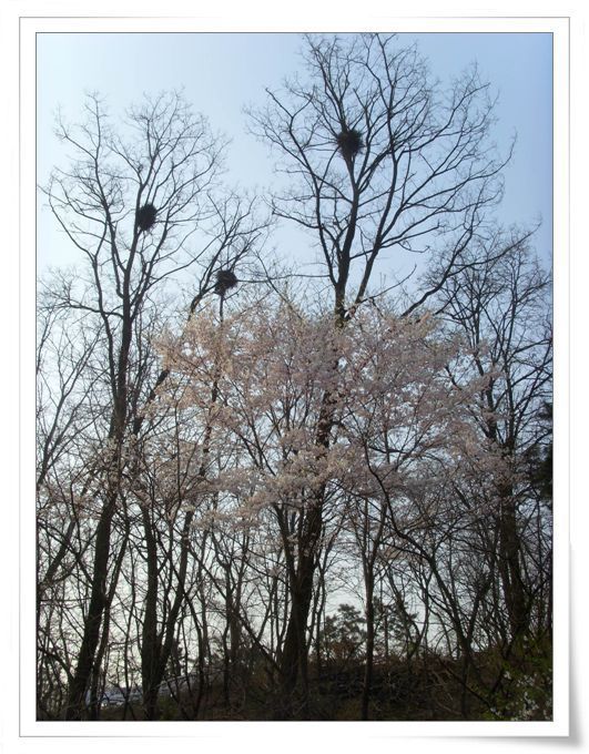 어쩌면 저 벚꽃 나무 위 아카시아 끝에 놓여진 둥지 중 하나가 딱따구리의 것은 아닐런지....