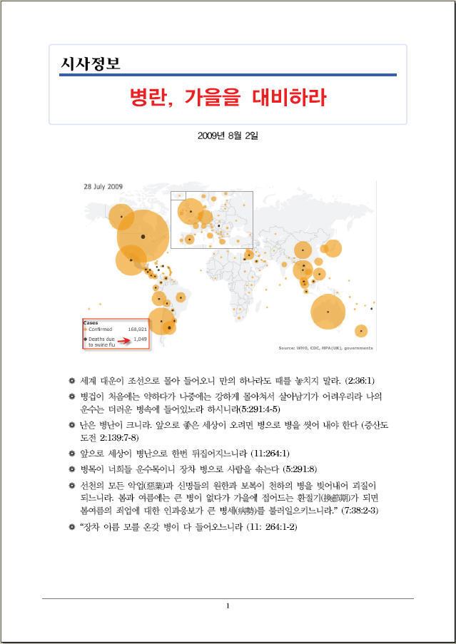 우리나라에서 신종플루 사망자 뉴스가 나오기 전이었기 때문에, 한편으로는 설마 설마 하면서 증산도의 괴질 관련 시사정보 자료를 포교용 겁박 자료 정도로 웃어 넘기려고 했는데, 막상 내용을 읽어보니 이미 전세계적으로 급증하는 사망자들의 수가 그야말로 장난이 아니더군요... 그것도 멕시코나 남미 등의 개발국만이 아니라, 첨단 선진국이라는 미국이나 영국에서까지도 대책을 세우느라 정신이 없다는 것을 실감나게 알았습니다...