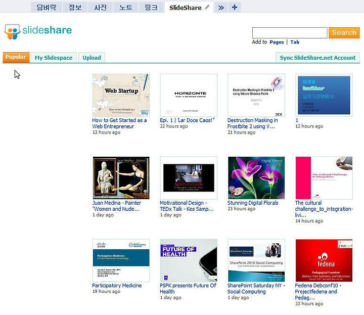 이름하여, 슬라이드세어(slidshare)라는 어플인데, 자신이 만든 파워포인트 파일을 웹 상에서 구동되는 슬라이드 파일로 변경시켜 친구들과 공유할 수 있을 뿐만 아니라, 인터넷이 연결되는 곳이라면 어디서든 자신의 노트북이나 휴대용 컴퓨터가 없더라도 강의안을 미리 올려두고 이것을 연결(다운로드)하여 청중에게 보여주고 강의까지 할 수도 있는 멋진 어플입지요....