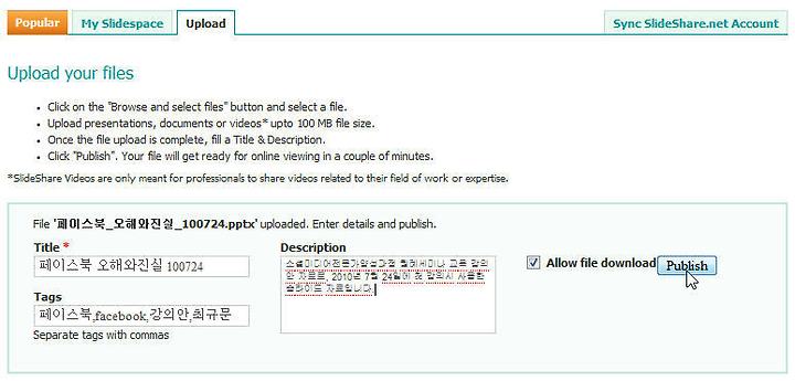 남들도 그 슬라이드를 다운받을 수 있도록 허용하고 싶으시면 뒷쪽의 [Allow file download] 앞 체크 박스에 갈매기 표시하시고 뒷쪽 [Publish] 버튼을 눌러주세요...