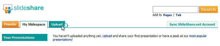 그러면 먼저 슬라이드 파일을 올리기부터 하셔야겠지요... 그 옆 뒷쪽 탭 [Upload] 탭을 클릭하세요...