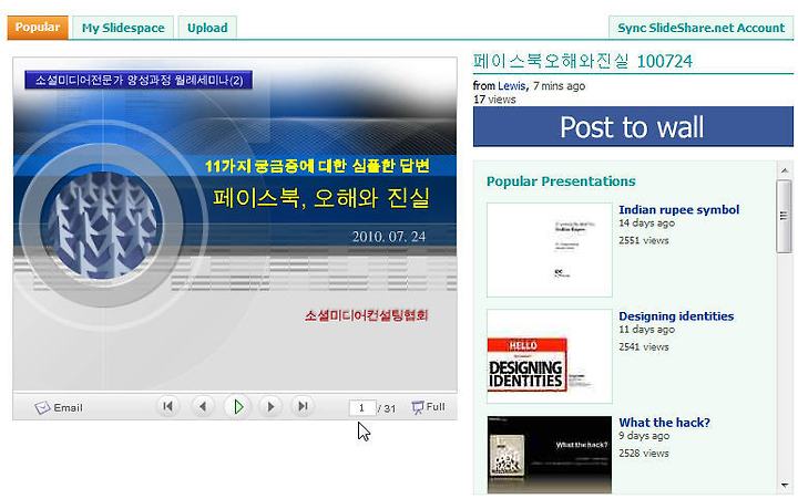 물론 슬라이드를 올렸다는 사실을 [Post to wall]을 눌러서 제 담벼락에다 공지해줄 수도 있지요... 친구들이 제 담벼락에 놓인 슬라이드 공유 안내 포스트를 보고 이미지를 클릭하면 유튜브 동영상 자동 구동되듯이 페이스북 홈피 안에서 내 슬라이드가 자동 구동됩니다...