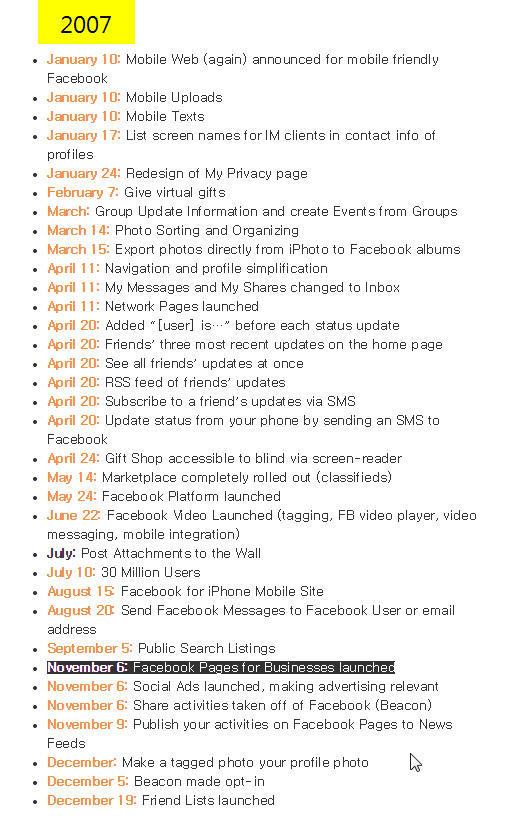 그러나 사용자들이 워낙 많다 보니 이 많은 사람들을 잠재고객이라 생각하는 수많은 비즈니스 운영자들의 욕심이 뒤따라 사람이 아니면서 사람인 것처럼 상호나 회사명, 상품이나 브랜드명으로 개인 프로필 계정을 만들어 사람들과 친구를 맺고 댓글을 다는 행위들이 끊이질 않았습니다. 결국, 페이스북은 브랜드를 위한 홍보용 도구로 [페이지]라는 비즈니스용 서비스를 제공하기 시작합니다.(페이스북의 히스토리를 뒤져보니까 2007년 11월 6일에 개시된 것으로 나오네요.)