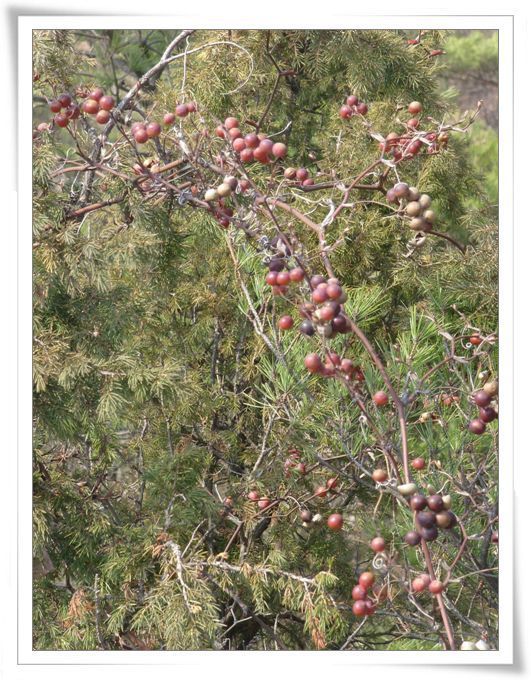 끊어진 바위 길 위편으로 소나무 측백나무 가지 위로 길게 얹혀 있는 머루 한 그루 무더기가