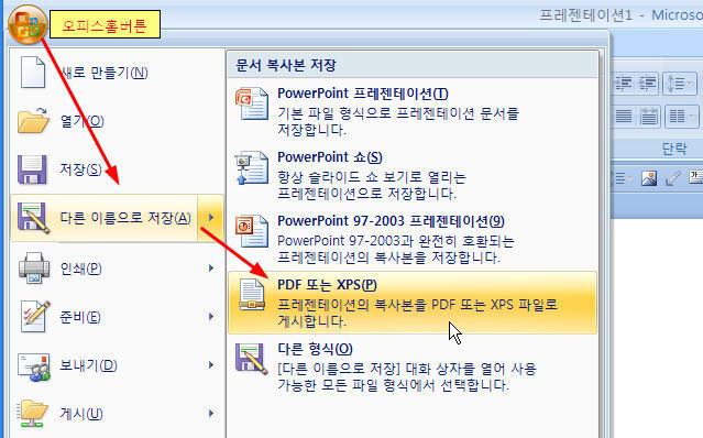 1) [오피스 홈버튼]=[홈단추]를 클릭 -> [다른 이름으로 저장] -> [PDF 또는 XPS] 클릭하면,