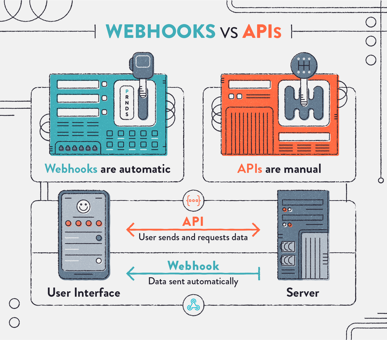 API는 서버간 혹은 서버-클라이언트간 데이터 호환시 한쪽의 요청에 대해 상대방이 허락을 해서 전해주는 쌍방향 대화 방식인 반면, 웹훅은 서버 쪽에서 특정 이벤트가 발생하면 그 사실을 클라이언트 쪽에 자동으로 알려주는 일방향 전달 방식이다. 굳이 물어보면 그 때마다 매번 일일이 답변을 하는 것이 아니라, 답변이 필요하겠다 싶으면(저쪽에서 질문을 굳이 하지 않더라도) 알아서 답변을 해줘버리는 것이다.