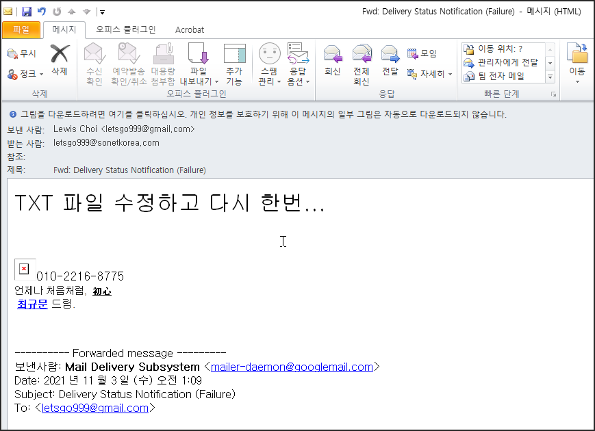 이런 추가 다운로드와 파일 변환 작업을 통해서야 겨우 eml 파일을 편지 형식으로 바꿔 열어보는 데 성공했다. ^^