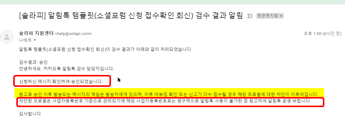 카카오 알림톡 템플릿 등록 신청에 대한 승인 안내시 경고문 내용