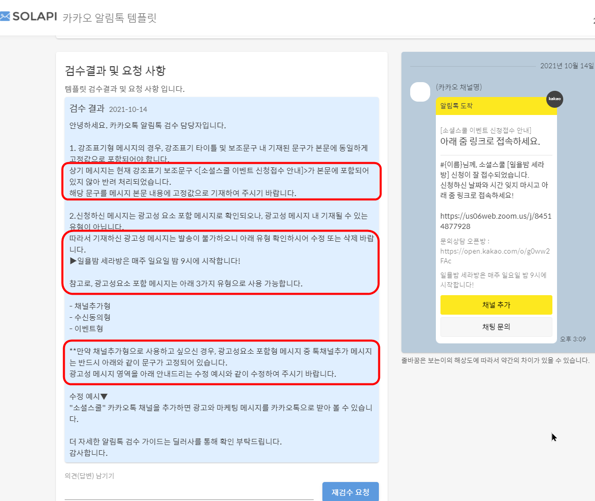 카카오 알림톡 템플릿 등록 신청에 대한 2차 반려 사유