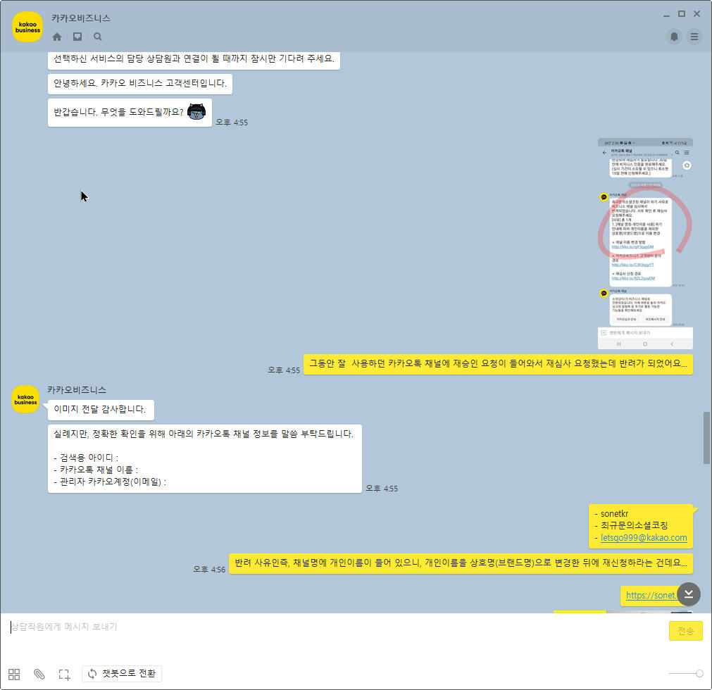 개인 이름이 들어있는 카카오톡 채널 이름을 왜 갑자기 바꾸라는 것인지 어필하는 내용그 동안 개인 이름 넣어 있어도 몇 년간 잘 쓰고 있었다는 인증 내용 첨부 항의그럼에도 불구하고 자신들의 카카오톡 채널 이름 운영 원칙상 안되는 이유에 대한 답변결론적으로 사업자등록증 상호에 맞추어서 이유 있게 채널 이름 변경하여 재신청하라는 당부의 말!!